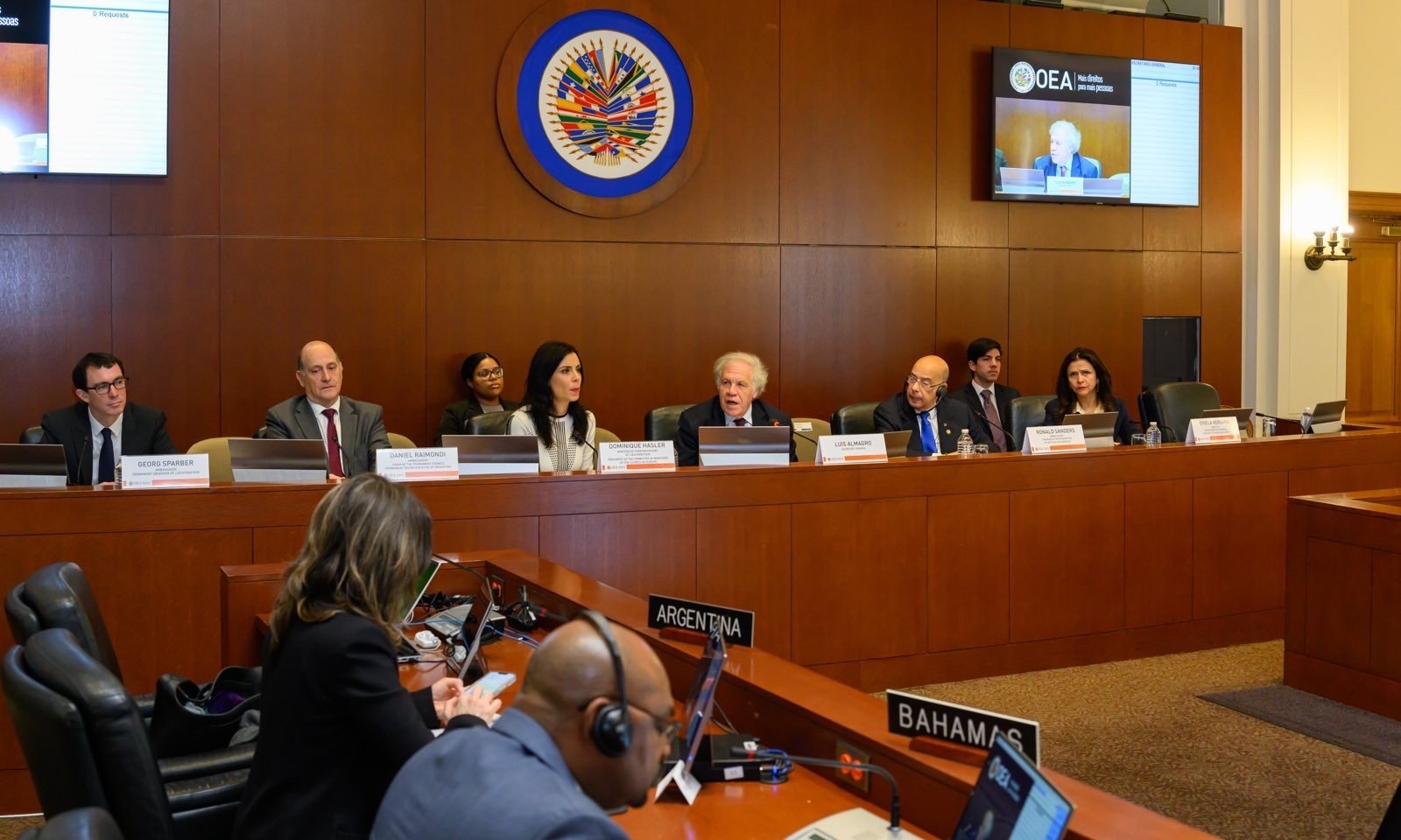 As Liechtenstein currently holds the presidency of the Committee of Ministers of the Council of Europe, Minister Hasler was invited to a dialogue with Permanent Representatives at the Organization of American States. The two sister organizations share a strong commitment to human rights, democracy and the rule of law. Minister Hasler was welcomed by the OAS leadership and took the opportunity to highlight a number of Liechtenstein’s priorities during its presidency that are of interest to the Western Hemisphere, followed by numerous interventions from OAS Member States.